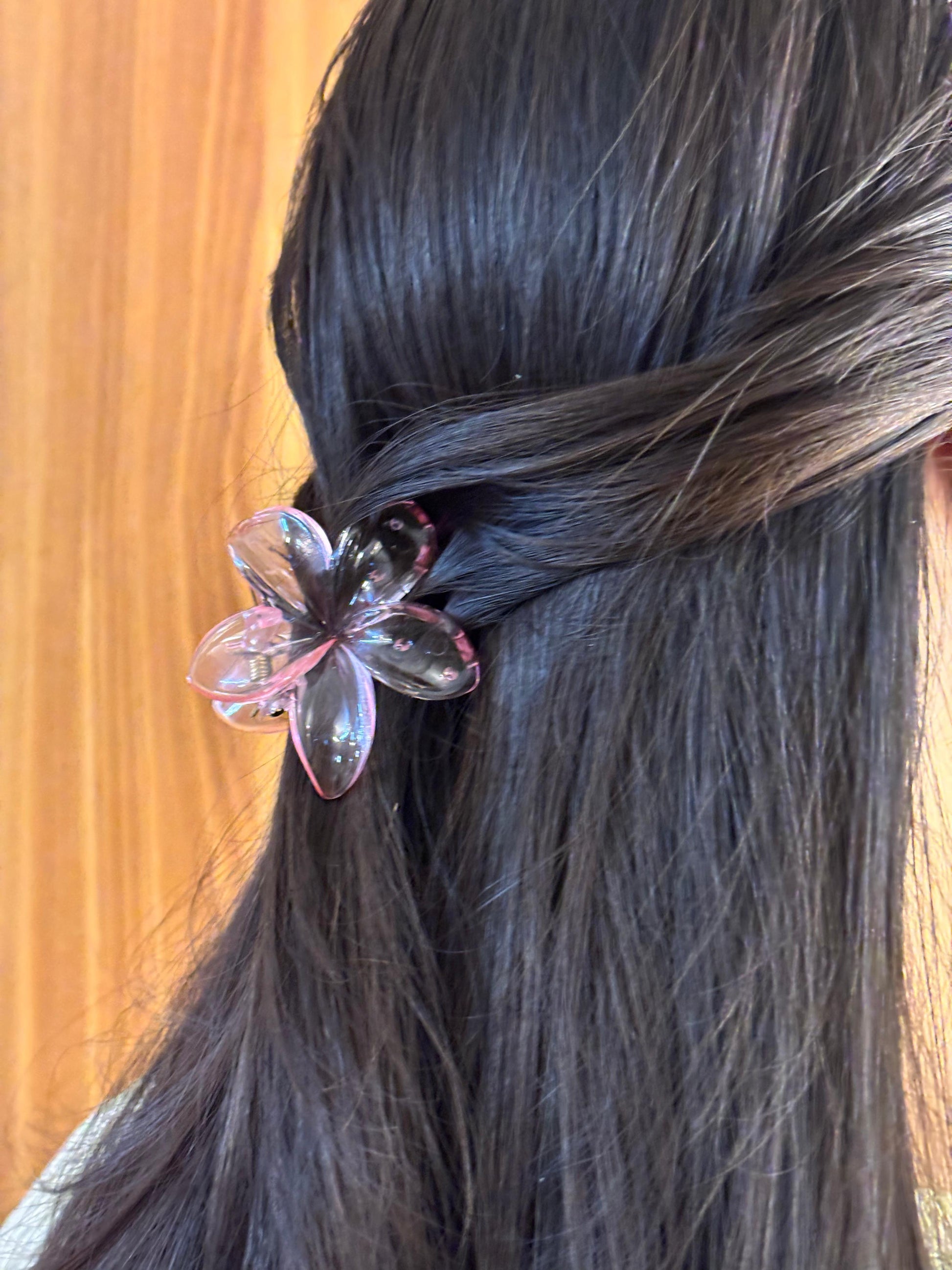 - Pink translucent flower hair clip โ Glossy floral-shaped hair clip with a soft translucent finish.