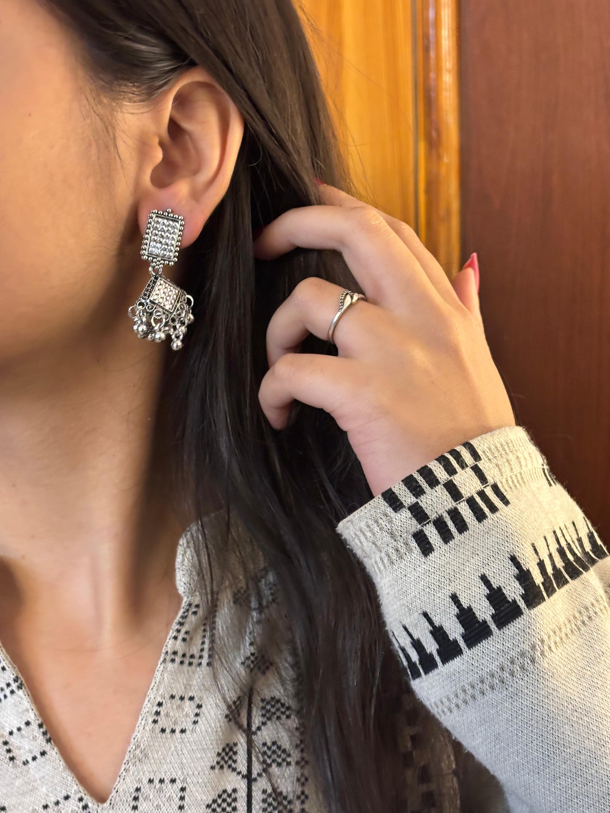 - Silver square & chain jhumka earrings โ Square stone stud with chain-linked mini jhumkas and oxidised detailing.