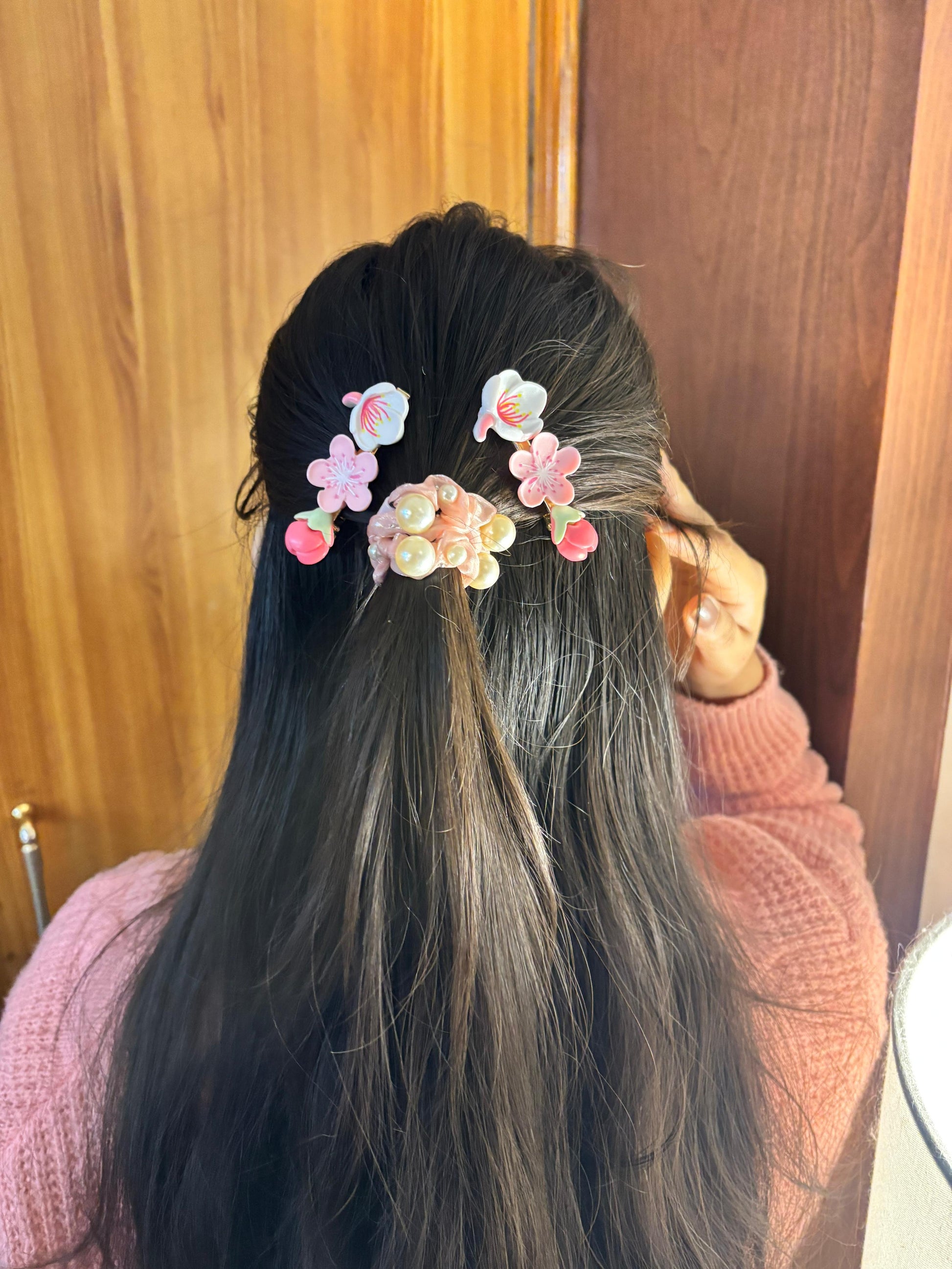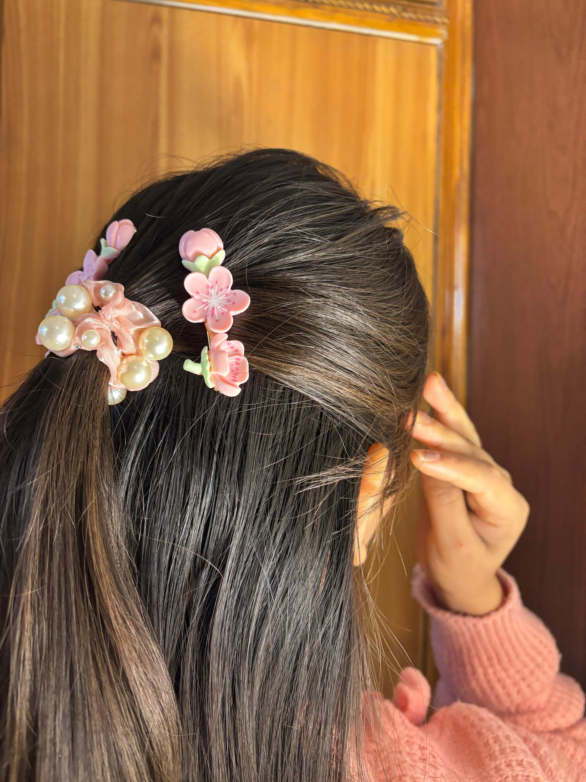 - Pink flower hair clips (pair) โ Translucent pink floral hair accessories