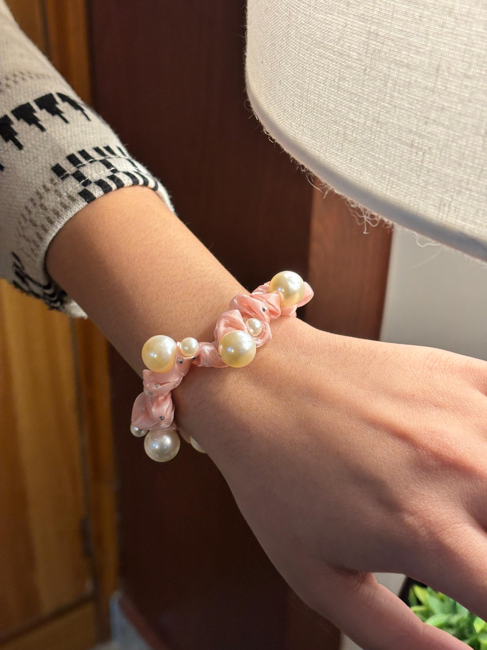 - Pink pearl scrunchie โ Satin scrunchie with pearl embellishments.
