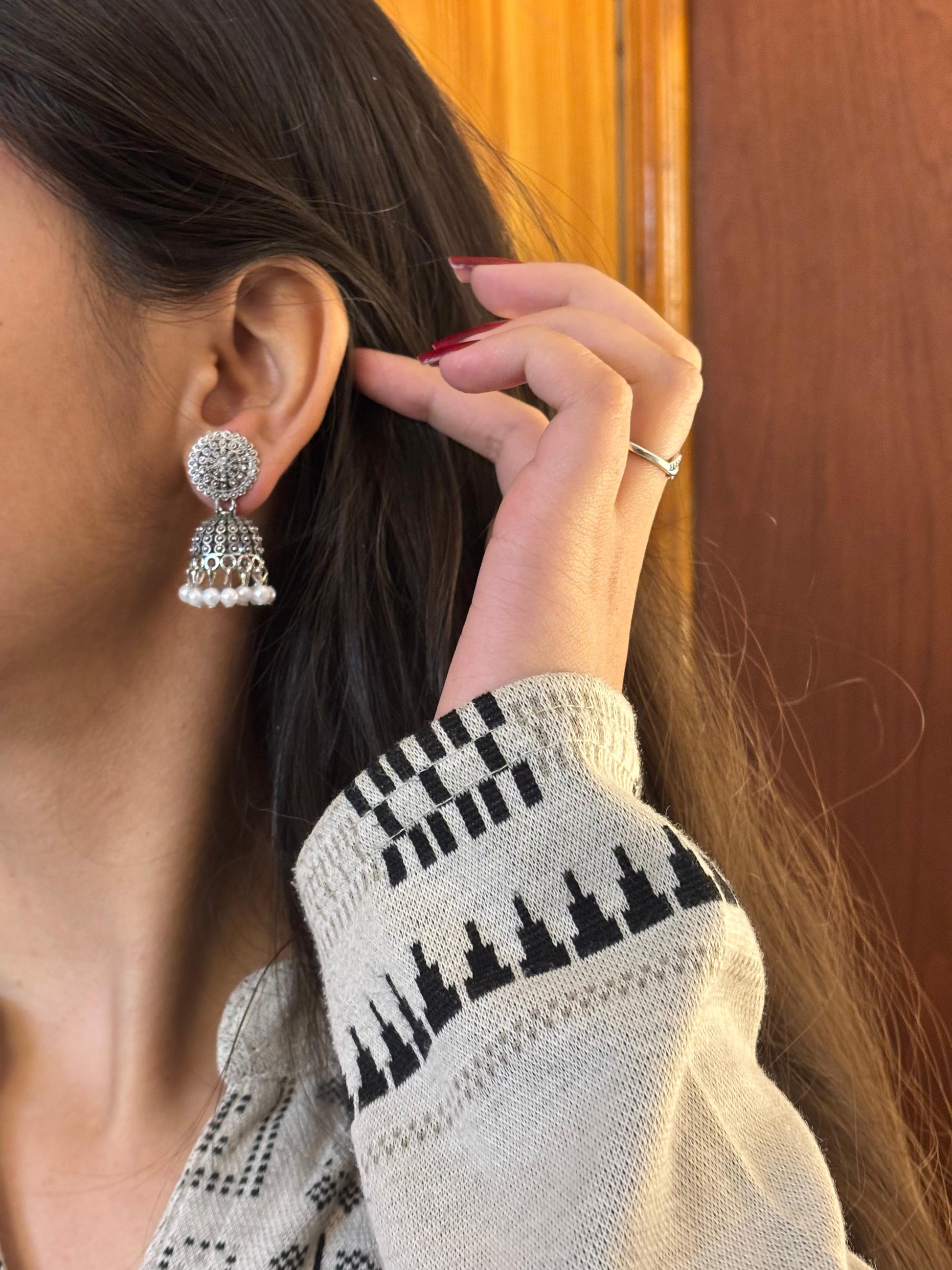 - Oxidised crescent jhumka earrings โ Semi-circular design with hanging bead accents.